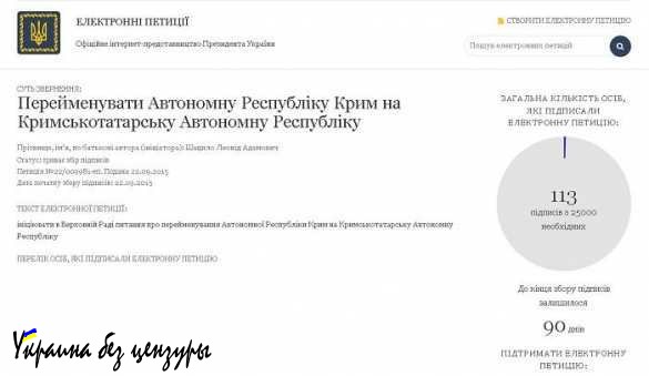 На сайте президента Украины Петра Порошенко в разделе петиций появилось требование переименовать Крым в Крымско-Татарскую Автономную Республику.