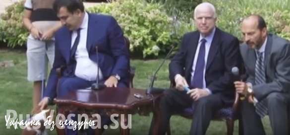 Губернатор Одесской области Михаил Саакашвили во время совместного брифинга с американским сенатором Джоном Маккейном внезапно потерял интерес к выступлению американского гостя и начал играть с собакой своего сына.