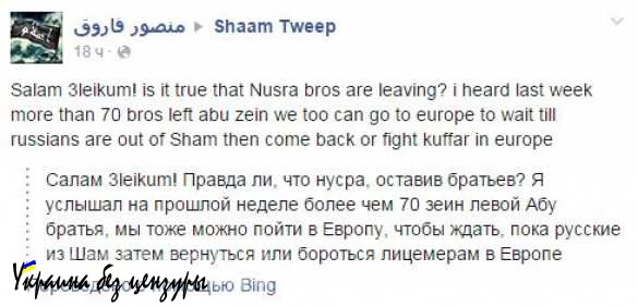 Появилось значительное количество постов и сообщений с призывами на время покинуть Сирию и перебраться в Европу в рядах беженцев, где «глупые неверные бараны дадут дом и деньги».