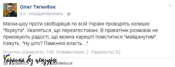 «Маски-шоу против свободовцев по всей Украине проводят бывшие «беркуты», — сообщает лидер партии «Свобода» Олег Тягнибок.