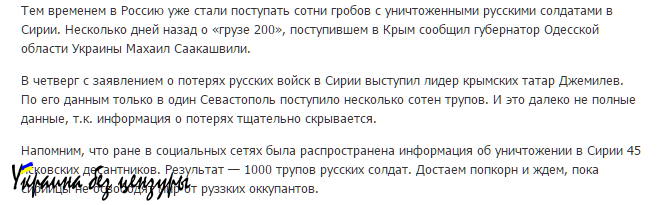 Несколько десятков раз украинские средства массовой дезинформации хоронили российского добровольца Арсена Павлова (Моторолу). Несколько раз не щедро наделенные фантазией киевские журналисты изолировали Россию от «цивилизованного мира». Ну а на этот раз украинское издание «News Daily» убило в Сирии аж тысячу российских спецназовцев: