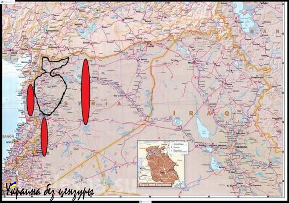 Накидал на карту очень примерно расположение ССА, ИГИЛовцев и прочих чертей ( в черном кольце) и примерно - армии Асада (черно-красном). Прозревая штабные замыслы, замечу, что нарисовывается натуральный "Идлибский котел". С одной стороны он очерчен границе с Турцией, с другой огорожен горами (высотами) по границе с Латакией. С юга еще один кулак Армии САР. С востока - дороги и городки контролируют "проасадовские силы". Прямо стоят тупо по дорожному полотну и редким городкам, аэродромам и военным базам.