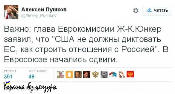 Важно: глава Еврокомиссии Ж-К.Юнкер заявил, что «США не должны диктовать ЕС, как строить отношения с Россией». В Евросоюзе начались сдвиги.