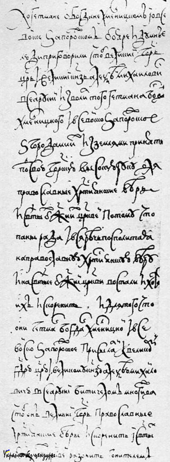 И они у Царского Величества запорожские черкасы милости просят со многим слезным челобитьем, чтоб он, Великий Государь, православные христианские веры искоренить в святых Божиих церквей разорить гонителем их и клятвопреступником не дал и над ними умилосердился, велел гетмана Богдана Хмель-ницкого и все войско Запорожское принять под свою государеву высокую руку. А будет Государь их не пожалует, под свою государеву высокую руку приняти не изволит, и Великий бы Государь Его Царское Величество для православные христианские веры и святых Божиих церквей в них вступился, велел их помирити через своих государевых великих послов, чтоб им тот мир был надежен. А собою они с поляками мирится отнюдь не хотят, потому что поляки в правде своей не стоят.