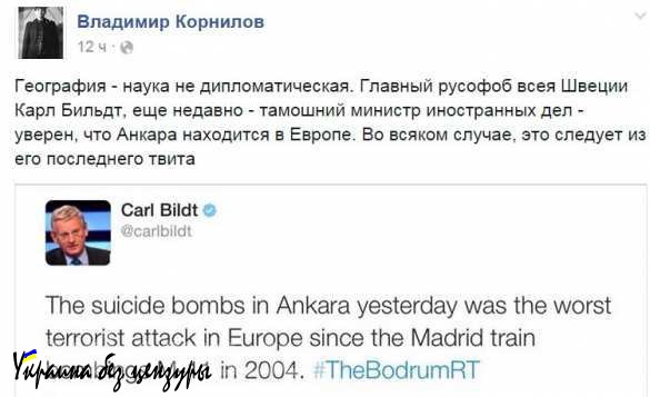 «География — наука не дипломатическая, — прокомментировал политолог запись шведского политика. — Главный русофоб всея Швеции Карл Бильдт, еще недавно — тамошний министр иностранных дел — уверен, что Анкара находится в Европе. Во всяком случае, это следует из его последнего твита».
