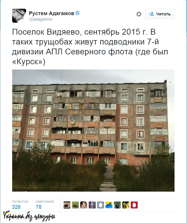 Вот такой записью в своем «Твиттере» разразился Адагамов 10 октября. Поселок Видяево, Мурманская область, с расположенной там же базой атомных подводных лодок Северного флота. Действительно, трагически погибшая АПЛ «Курск» была приписана именно там.