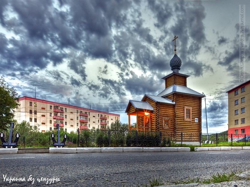 Смотрим дальше. Рубленый храм поставлен в честь погибшего экипажа «Курска», на сороковой день после похорон подводников: