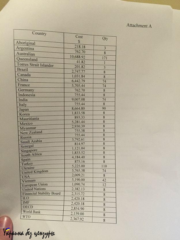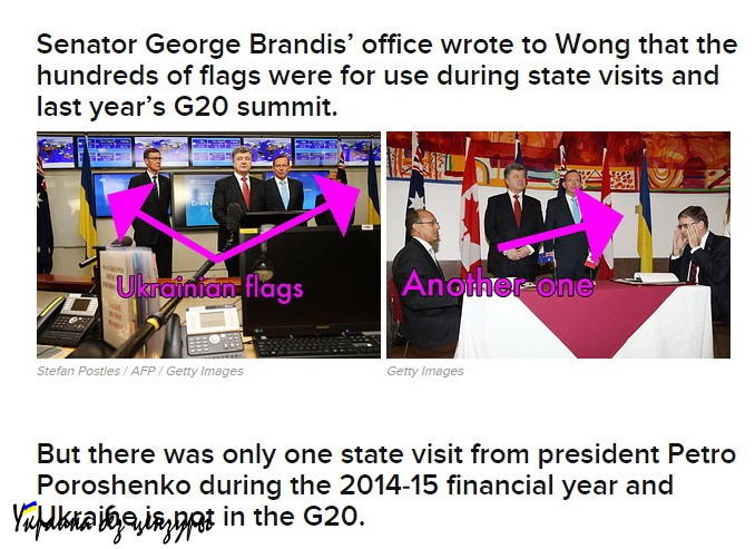 Так, за прошлый год Тони Эбботт приобрел 110 флагов Украины, при том, что Украина не является членом G20 и Порошенко совершил за 2014–2015 только один визит в Австралию. Больше приобретено только непосредственно флагов Австралии — 174.