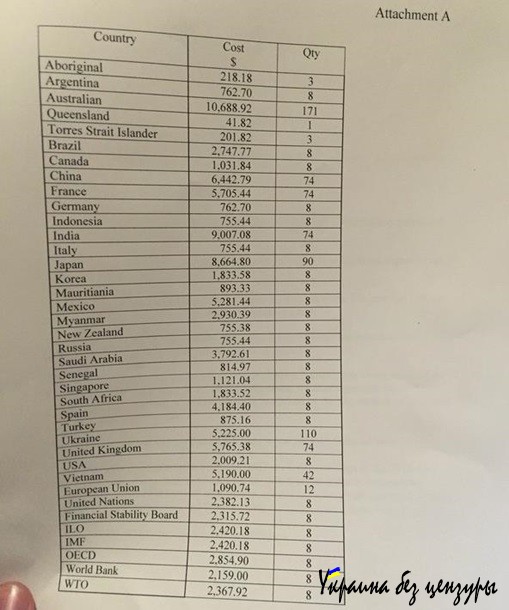 Документы включают подробную таблицу, из которой следует, что офис экс-премьера закупил украинских флагов в 36 раз больше, чем флагов местных аборигенов.