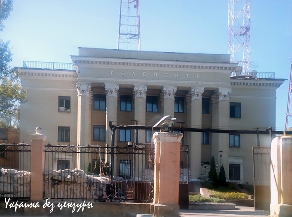 Внешне здание Донецкого Телецентра изменилось незначительно. Лишь баррикады из мешков с песком напоминают о событиях, происходивших здесь ранней весной 2014 года. Остались на своих местах и горы старых автомобильных покрышек, да охрана теперь состоит не из упитанных милиционеров, а из подтянутых ребят с АК.