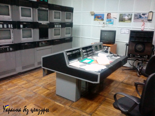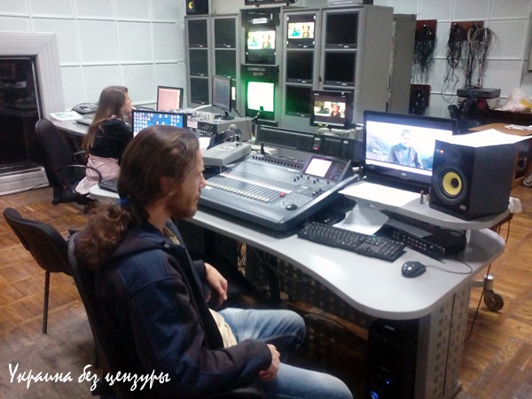 Сердце телеканала, вернее, ее мозг. Здесь, за режиссерским пультом, монтируют сюжеты, выводят в эфир телепередачи. Люди, ответственные за эфир, полностью сосредоточены на работе, но узнав, что к ним в гости пришли представители «Русской Весны», немного отвлеклись и даже сделали нам небольшую экскурсию по своему хозяйству.