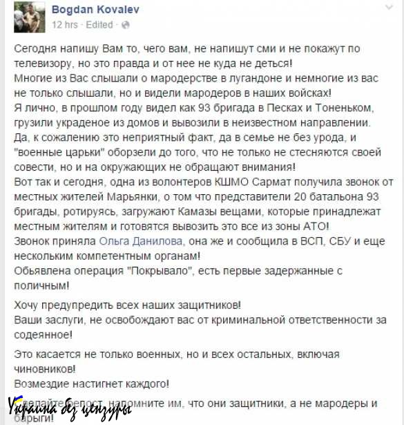 19 октября сотрудник Министерства Обороны Украины написал на своей станице в Facebook о масштабах мародёрства, совершаемого украинскими военнослужащими в зоне так называемой АТО.
