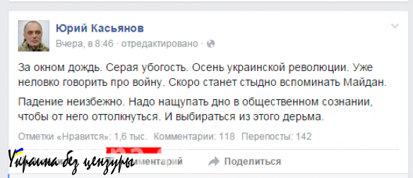 Известнейший «волонтер АТО» и активист Майдана, Юрий Касьянов, на своей страничке в ФБ признался, что падение неизбежно и что скоро придется стыдиться и войной, и Майданом.