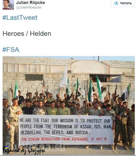 На фото люди утверждают, дословно, следующее: «Мы — Сирийская свободная армия! Наша миссия — защищать наш народ от терроризма Асада, ИГИЛа, Ирана, „Хезболлы”, чертей и России. Сирийская революция — из Кафранбеля, 17 октября 2015».
