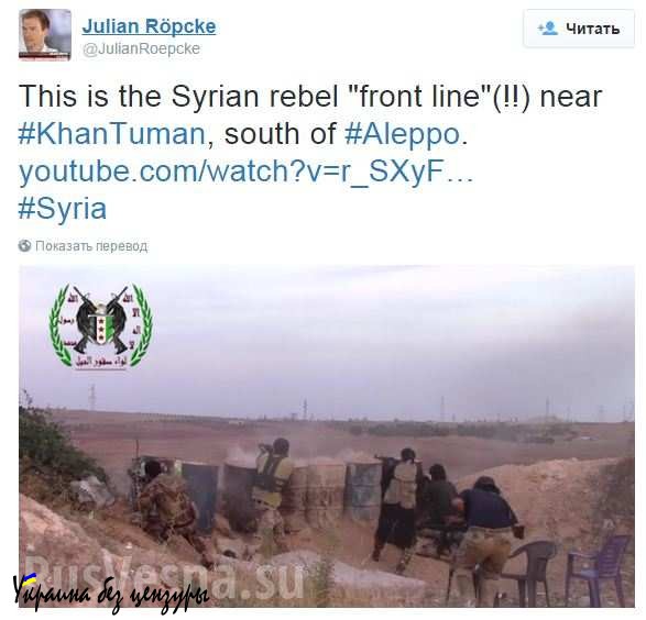 Что всё это означает — то ли боевики запрещенной в РФ террористической группировки ИГИЛ, обкурившись гашиша, открыли охоту на тушканчиков, то ли мужественные революционеры отбиваются от войск Башара Асада — по самому видео понять нельзя никак. Тем не менее, Джулиан поясняет зрителям: это «линия фронта» сирийских повстанцев к югу от Алеппо. Как не поверить.