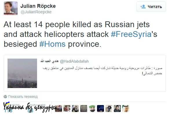 «По меньшей мере 14 человек убито русскими самолётами и ударными вертолётами, атаковавшими Сирийскую свободную армию в провинции Хомс», уведомляет Джулиан. Подкрепляя заявление фотографией от Хади аль Абдаллаха , на которой два Ми-24 летят над неким населённым пунктом, отстреливая тепловые ловушки.