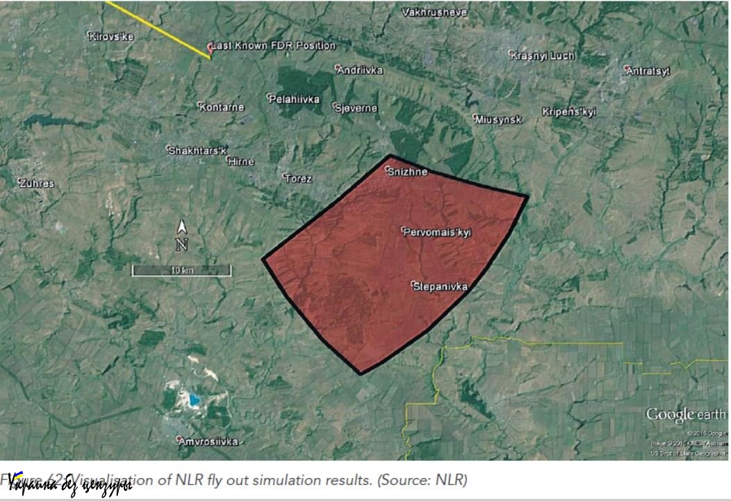 А теперь давайте все-таки вернемся к заявлению Юстра о том, что на картах, приведенных в докладе следственной комиссии, при «правильном» их просмотре однозначно проявится вина «пророссийских повстанцев». На самом деле, в докладе (раздел 3.8.6 — далее все подобные цифры будут обозначать ссылки на соответствующие разделы финального отчета следственной комиссии) содержится карта, на которой обозначена довольно обширная зона возможного запуска ракеты площадью 320 квадратных километров.