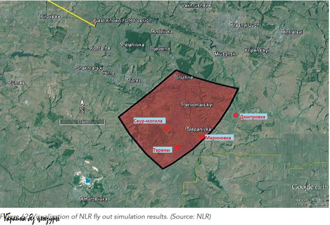 Итак, подчеркнем, основные скопления боевых подразделений и боевой техники обеих армий находились в Снежном и Мариновке. Если вы посмотрите на карту отчета по сбитому «Боингу» с наложенными на нее географическими названиями, то убедитесь, что, собственно, вся зона возможного нахождения злополучной установки «Бук», сбившей «Боинг», — это и есть территория между Снежным и Мариновкой, где велись ожесточенные бои. Причем Мариновка, где тогда были сосредоточены колоссальные силы ВСУ, также находится в этой зоне, что уже опровергает «неофициальные» умозаключения Юстра.