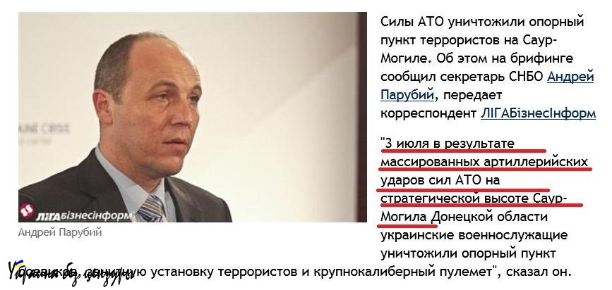 Однако подчеркнем, бои за эту высоту активно велись с самого начала июля. 4 июля тогдашний секретарь СНБО Андрей Парубий отчитался, что накануне «силы АТО» нанесли артиллерийские удары по Саур-Могиле.