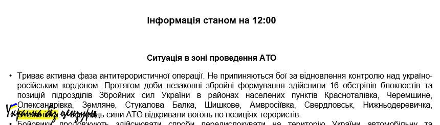 Хочу особо обратить внимание на названия географических пунктов этого района, приводимых как места сосредоточения украинских ВСУ в официальных сводках т. н. «штаба АТО» и СНБО Украины: Степановка, Тараны, Дмитровка. 15 июля СНБО официально сообщил, что «незаконные вооруженные формирования» обстреляли позицию украинских войск в районе Степановки.