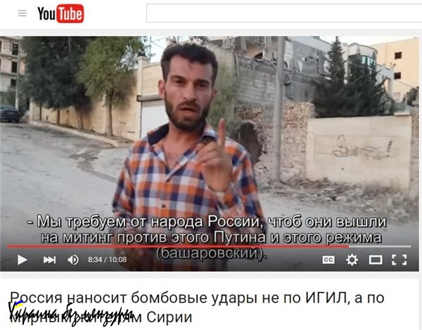 На днях было опубликовано внушительное – не так часто встретишь десятиминутный срыв покровов – «свидетельство очевидцев». Сообщающих всю как есть правду о бомбардировках русских варваров, устраивающих форменный геноцид мирного населения Сирии. Состоящего, как любому ясно, из оппозиционеров - один другого умереннее, а все террористы – это выдумки Кремля и Башара Асада.