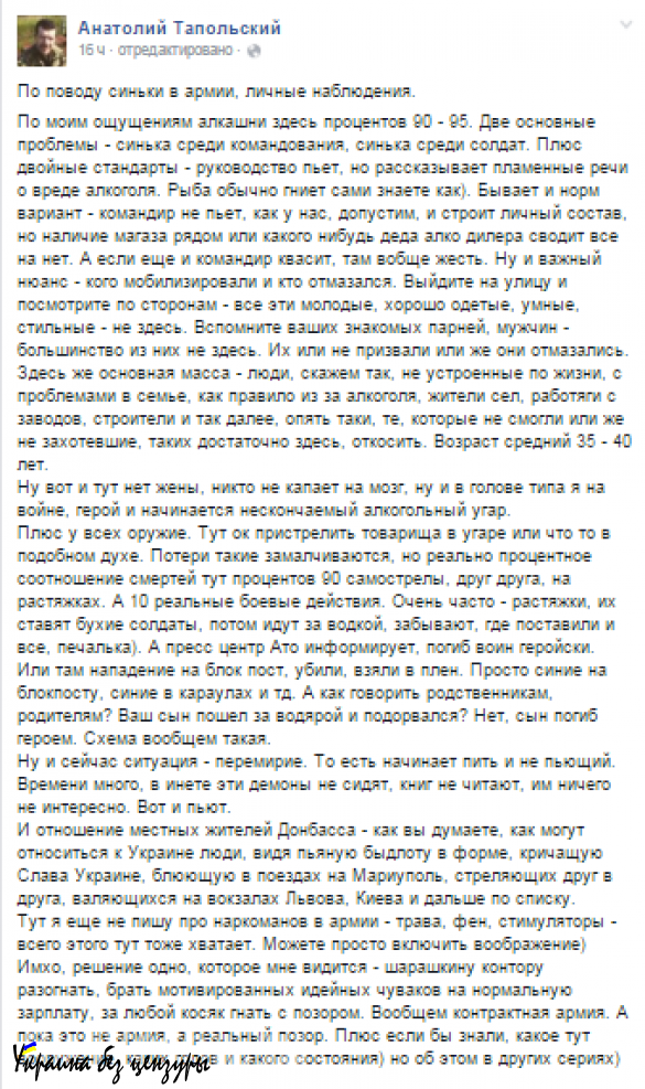 Как уже неоднократно сообщалось ранее, алкоголизм в рядах ВСУ приобрел массовый характер. Военнослужащий украинской армии Анатолий Тапольский в своем Facebook еще раз подтвердил этот вывод и поделился своим взглядом на проблему.