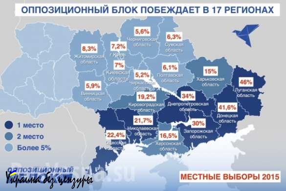 По предварительным результатам, «Оппозиционный блок» одержал «безусловную победу в семи областях Украины», отмечает партия.