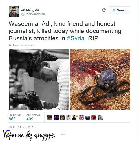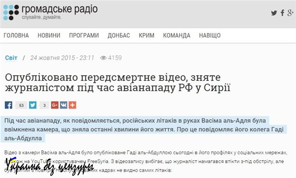 «Во время авианалетов российских самолетов в руках журналиста Васима аль-Адля была включена камера, которая сняла последние минуты его жизни. Об этом сообщает его коллега Гади аль-Абдулла», — пишет Громадське.ТВ с многочисленными перепостами в других СМИ и соцсетях.