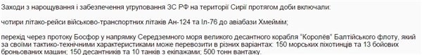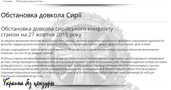 «Российская сторона активизирует вербовку наемников, участвовавших в боевых действиях на Востоке Украины, для их последующего направления в Сирию. Мероприятия проводятся скрыто, без развертывания агитационных пунктов и объявлений в СМИ. Предпочтение отдается лицам, имеющим опыт деятельности в составе диверсионных разведывательных групп. Отбор проводится представителями ФСБ РФ непосредственно в пунктах постоянной дислокации воинских частей, а оформление документов — в Управлении ФСБ РФ в Ростовской области (Ростов-на-Дону;), сторонами подписывается контракт. 26 октября с из Луганска в Ростов-на-Дону отбыла очередная группа наемников (20 человек) для последующего направления в Сирию».