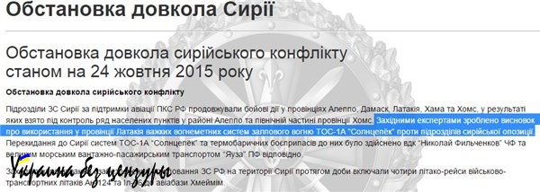 После такого подвига следующую сводку, от 25 октября, можно было сделать краткой. В ней украинские разведчики, вдоволь насмотревшись YouTube за 22 число, сообщили, что «западными экспертами сделан вывод об использовании в провинции Латакия тяжелых огнеметных систем залпового огня ТОС-1А „Солнцепёк“ против подразделений сирийской оппозиции».