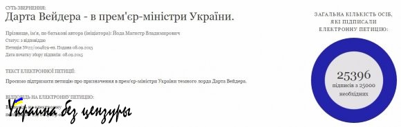 Петиция под названием «Дарта Вейдера — в премьер-министры Украины» набрала 25396 подписей из 25000 необходимых.