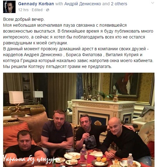 «В данный момент провожу домашний арест в компании своих друзей — нардепов Андрея Денисенко, Бориса Филатова, Виталия Куприя и коптера Грицака, который нахально завис напротив окна моего кабинета. Мы решили коптеру пятьдесят грамм не предлагать», — написал Корбан.