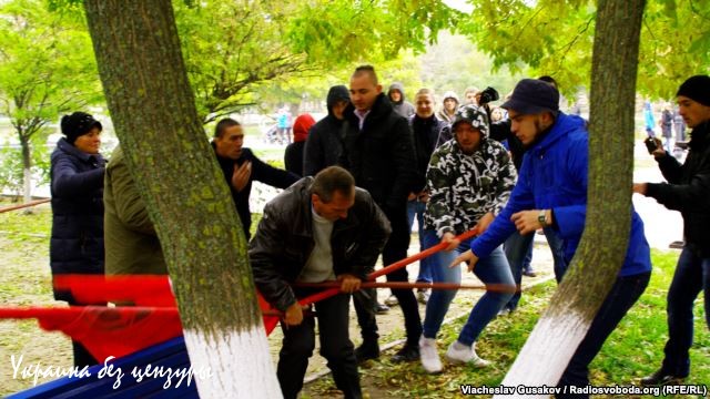Пророссийские активисты и сочувствующие им сорвали флаг Украины, поднятый вчера майдановцами на