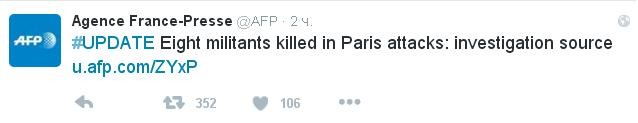 4 террориста убиты в здании театра «Батаклан», еще трое подорвали себя у стадиона «Стад де Франс», восьмой нападавший убит на улице в восточной части Парижа.