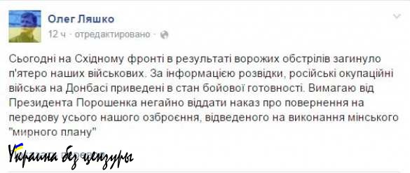 «Сегодня на Восточном фронте в результате вражеских обстрелов погибло пятеро наших военных. По информации разведки, российские оккупационные войска на Донбассе приведены в состояние боевой готовности. Требую от Президента Порошенко немедленно отдать приказ о возвращении на передовую всего отведенного вооружения», — написал политик.