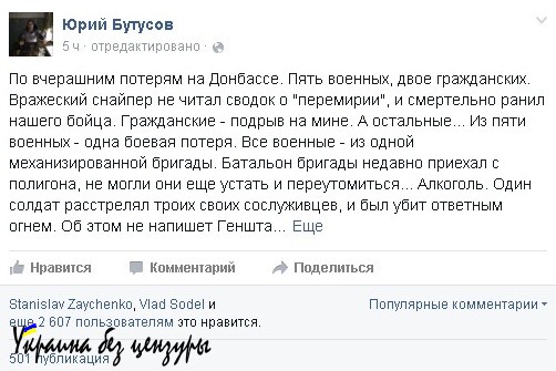 «Из пяти военных — одна боевая потеря. Все военные — из одной механизированной бригады. Батальон бригады недавно приехал с полигона, не могли они еще устать и переутомиться… Алкоголь. Один солдат расстрелял троих своих сослуживцев, и был убит ответным огнем. Об этом не напишет Генштаб, такими трагедиями занимается только военная прокуратура» — написал Бутусов.