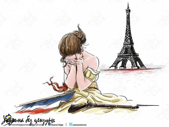 Так, иорданский карикатурист Осама Хаджаж изобразил Францию красивой плачущей женщиной на фоне Эйфелевой башни.