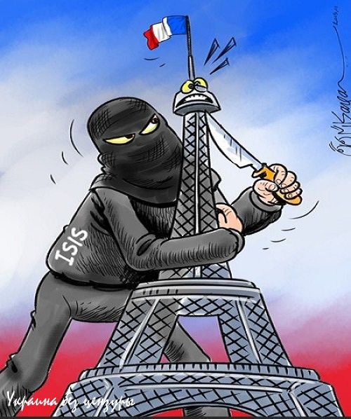 Арабские карикатуристы отреагировали на серию террористических актов, произошедших в Париже. В результате нападений террористов, напомним, погибло, по последним данным, 129 человек.