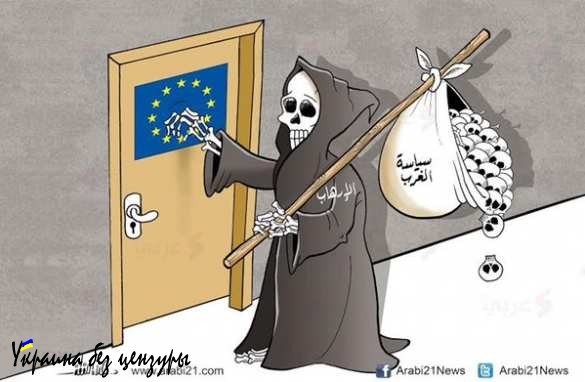 А этот рисунок, размещенный на портале Arab21, изображает то, как европейская политика на Ближнем Востоке, описав круг, вернулась в Европу.