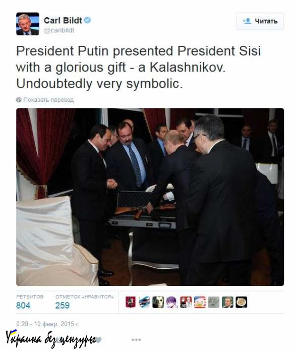 9 февраля 2015 года президент России прибыл с двухдневным официальным визитом в Египет. На следующий день Владимиру Путину предстояло обсудить с президентом Абделем Фаттахом ас-Сиси актуальные вопросы международной повестки дня и перспективы развития отношений между двумя странами. Путин решил подарить египетскому коллеге самую известную продукцию российского ВПК: автомат Калашникова. В Европе этот жест назвали символическим.