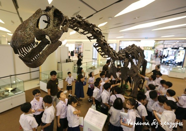 Тайские студенты осматривают скелет динозавра, останки которого были обнаружены в провинции Каласин. Выставка окаменелостей проходит в честь 60-летия принцессы Маха Чакри Сириндорн
