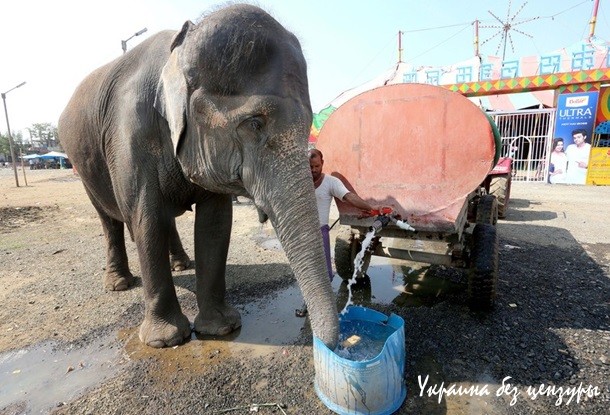 Слон утоляет жажду перед шоу в цирке Бхопала. Цирковое искусство является одним из старейших и самых популярных форм в наши дни в Индии