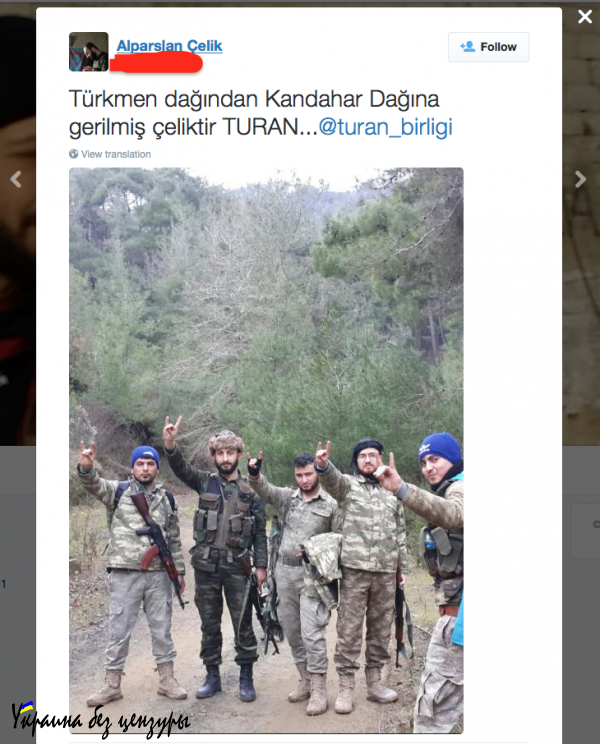 Ну а теперь самое главное в этой истории. Вас не смутила фотография выше, где Альпаслан стоит вместе с толпой вооруженных людей на фоне голубого флага? Вот эта.