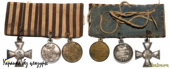 Наградная колодка времён Крымской войны: Знак отличия военного ордена Святого Великомученика и Победоносца Георгия, медали — «За защиту Севастополя» и «В память Крымской войны 1853–1854–1855–1856 г. г».. Колодка привязывалась к мундиру на верёвочках.