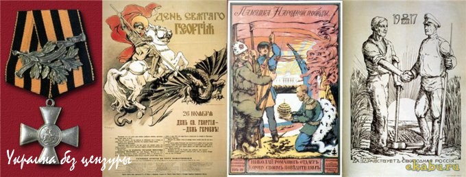 Слева: Георгиевский крест с лавровой ветвью. Таким награждались после февраля 1917 года офицеры, отличившиеся в бою. Для получения награды требовалось решение собрания нижних чинов. Справа: Плакаты 1914–17 гг.