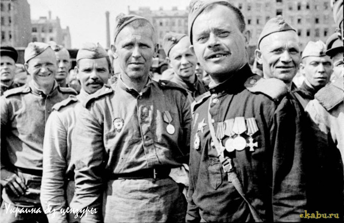 1945-й год. Демобилизованные воины, прибывшие в Ленинград. Справа — участник трех войн гвардии рядовой Ф.Г. Вадюхин. Знаменитая фотография, свидетельствующая о необычном для Красной Армии правиле, появившемся во время войны — кавалерам Георгиевских крестов было неофициально разрешено носить эти награды. (Фото по ссылке: http://waralbum.ru/38820/).
