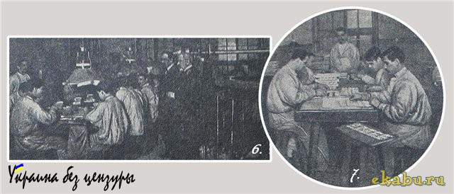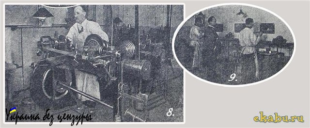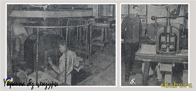 После того, как из плавильного отделения выйдут полосы металла, от первой, последней и средней полос данной партии берутся небольшие кусочки металла и отправляются в особое «пробирное» отделение Монетного Двора, в каковом отделении и производится при помощи исключительно точных инструментов определение пробы металлов (снимок № 9). Упомянем еще и о штемпелерезных автоматических машинах, изготовляющих штампы для медалей и крестов (снимок № 8).