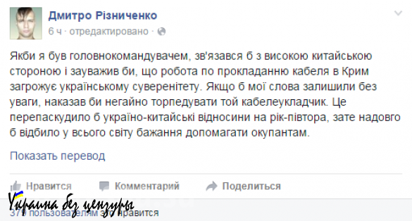 «Если бы я был главнокомандующим, то связался бы с высокой китайской стороной и отметил бы, что работа по прокладке кабеля в Крым угрожает украинскому суверенитету. Если бы мои слова оставили без внимания, приказал бы немедленно торпедировать этот кабелекладчик. Это испортило бы украино-китайские отношения на год — полтора, зато надолго отбило бы у всего мира желание помогать оккупантам», — написал он в Facebook.