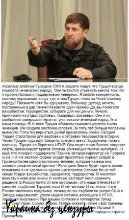 — Сегодня Турция стала базой для вербовки и отправки террористов в Сирию. Через Турцию туда идут бандиты со всего света. Задержаны только единицы. Турция не борется с ИГИЛ! Она ведет с ним бизнес, покупает нефть, финансирует врагов ислама, убивающих тысячи мусульман, — пишет Рамзан Кадыров.