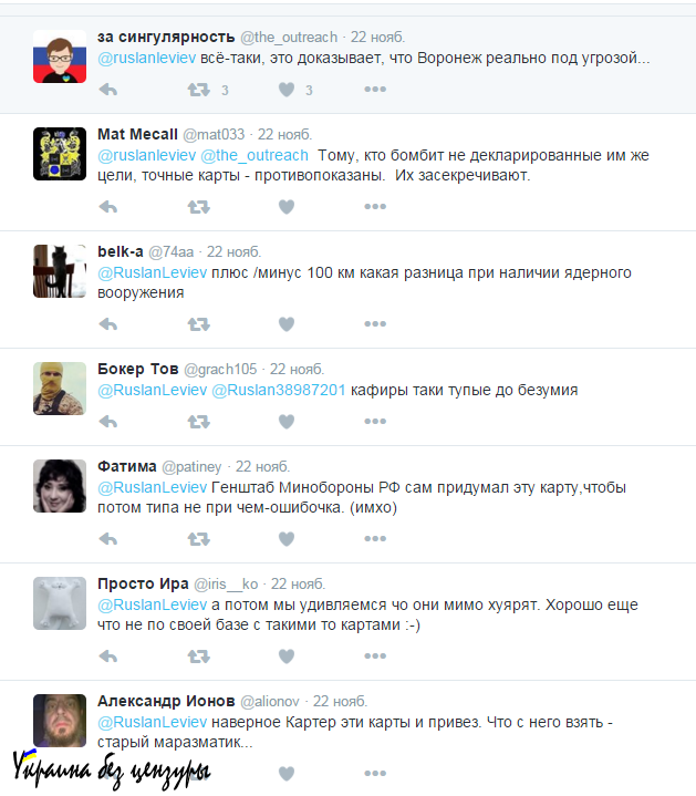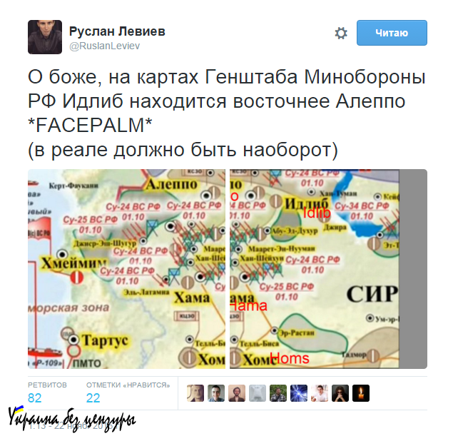 Тут же нашлось множество не менее профессиональных, чем Руслан Левиев, «картогрофов», которые стали радостно обсуждать эту новость, соревнуясь между собой в желчности комментариев. Мол, в век высоких технологий и карт «гугл мапс», Генштаб не может разобраться, где какой город в Сирии находится. Караул, бардак!